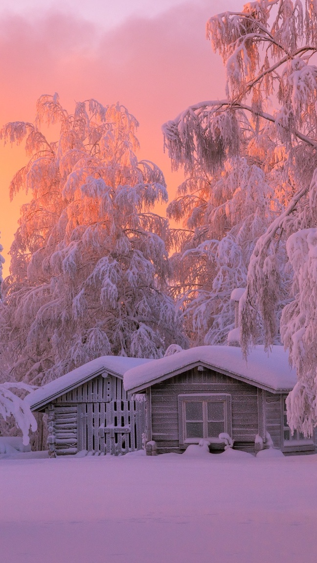 Edytor tapety: Drewniane ośnieżone domki w zimowym lesie