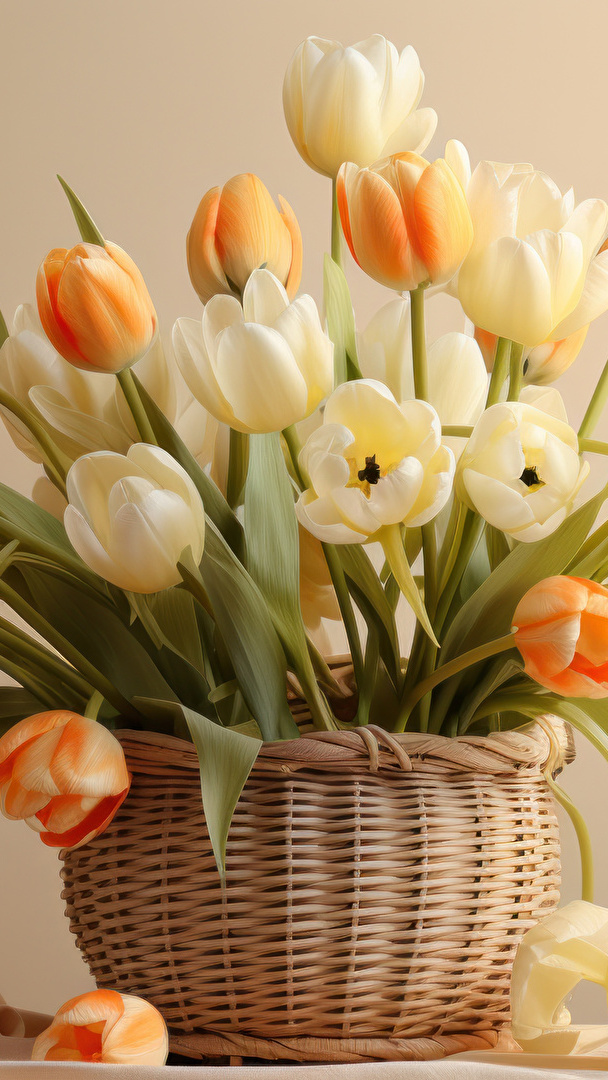 Edytor tapety: Kolorowe tulipany w wiklinowym koszu
