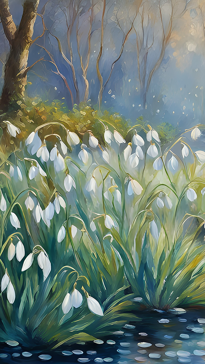 Edytor tapety: Przebiśniegi pod drzewami w grafice