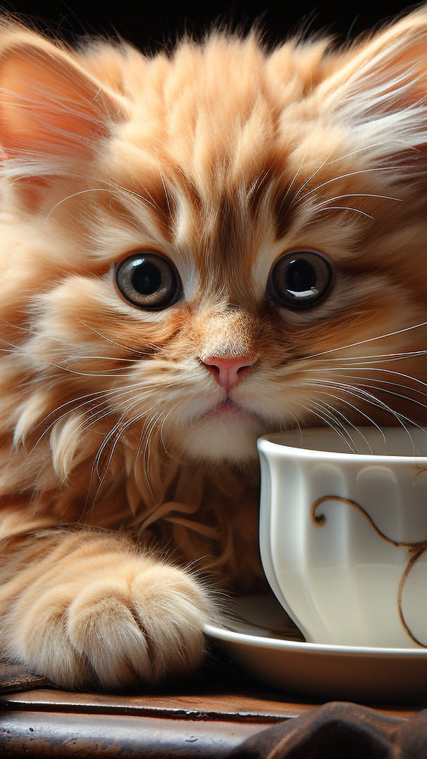 Edytor tapety: Rudy mały kotek obok filiżanki