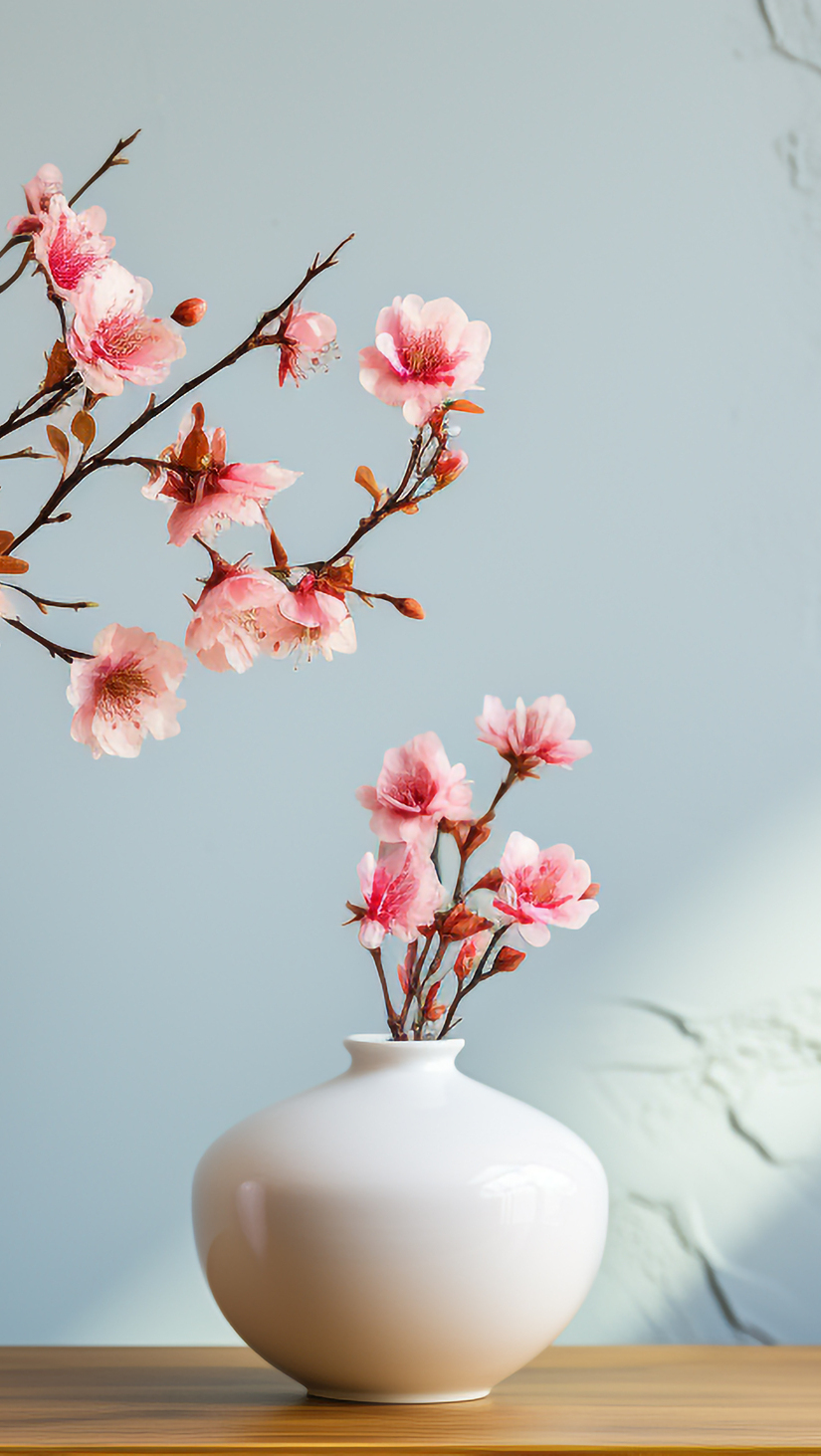 Edytor tapety: Wazon z kwitnącymi gałązkami na stole