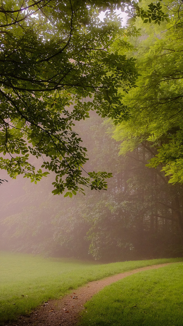 Edytor tapety: Zamglona ścieżka prowadząca do lasu