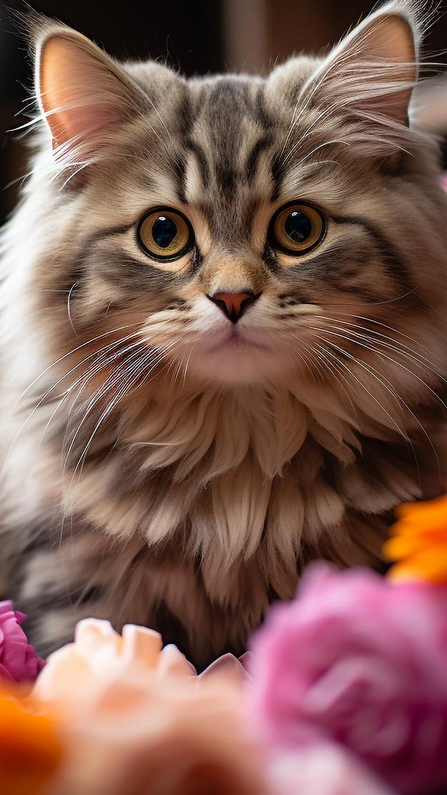 Edytor tapety: Puszysty kot i kwiaty