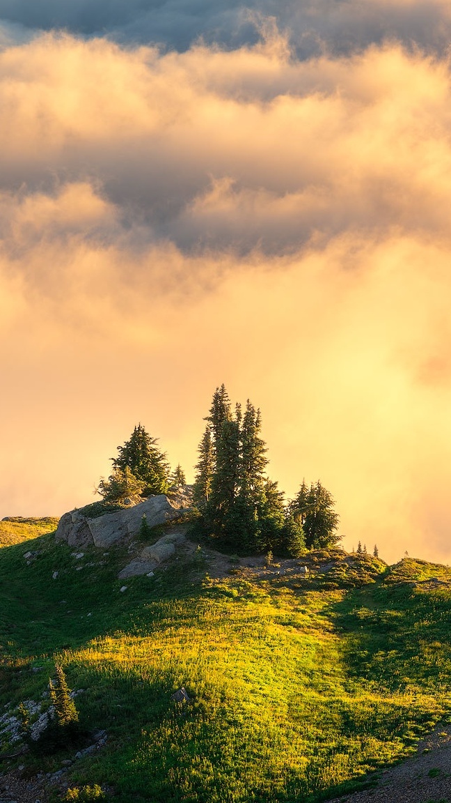 Edytor tapety: Drzewa na wzgórzu na tle mgły