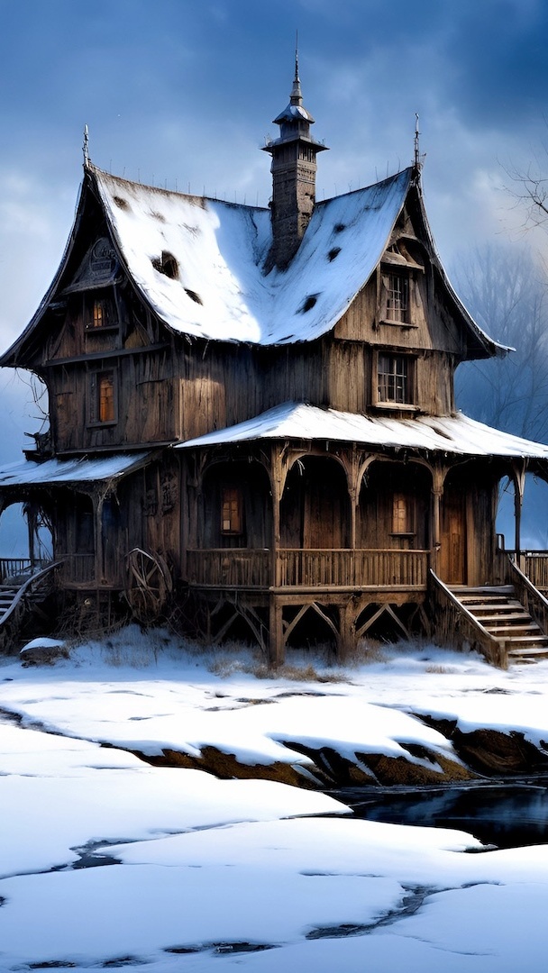 Edytor tapety: Ośnieżony drewniany dom w grafice