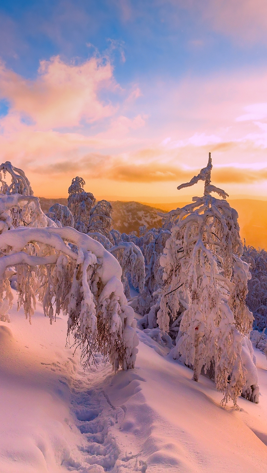 Edytor tapety: Ośnieżone drzewa w zaspach na wzgórzu