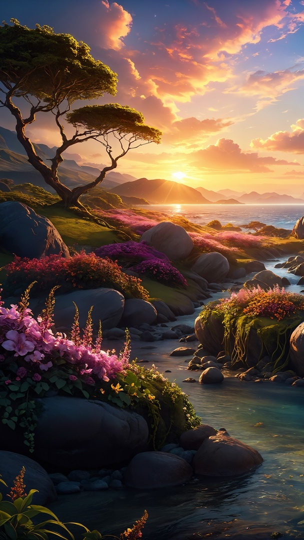 Edytor tapety: Kamienie i kwiaty nad rzeką