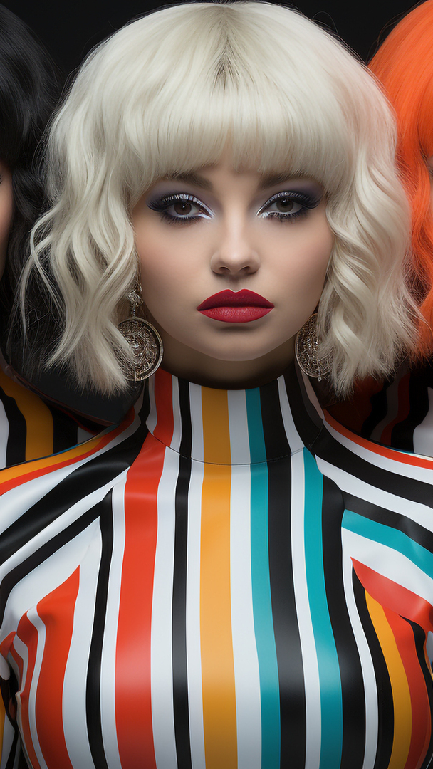 Edytor tapety: Blondynka w kolorowym ubraniu w paski
