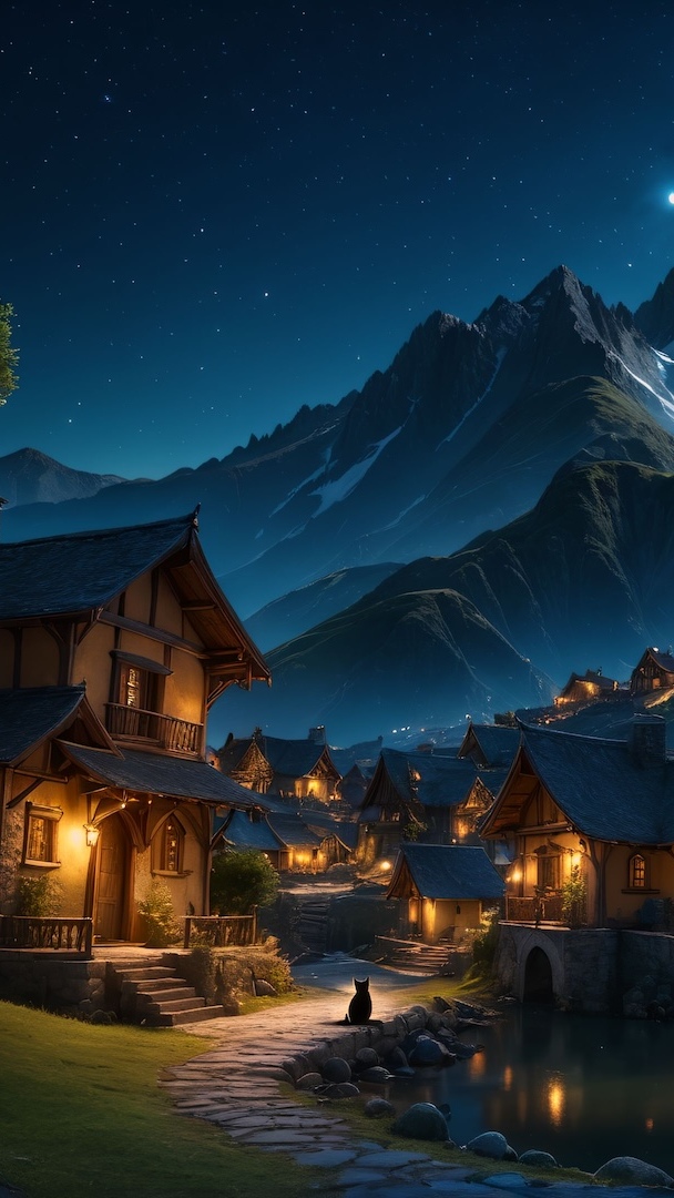 Edytor tapety: Oświetlone nocą domy w górskiej wiosce