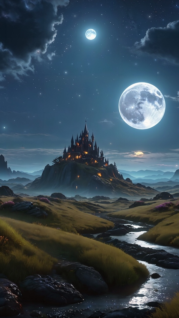 Edytor tapety: Zamek i rzeka w blasku księżyca
