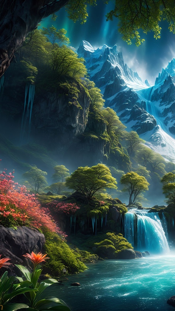 Edytor tapety: Kwiaty i drzewa przy wodospadach