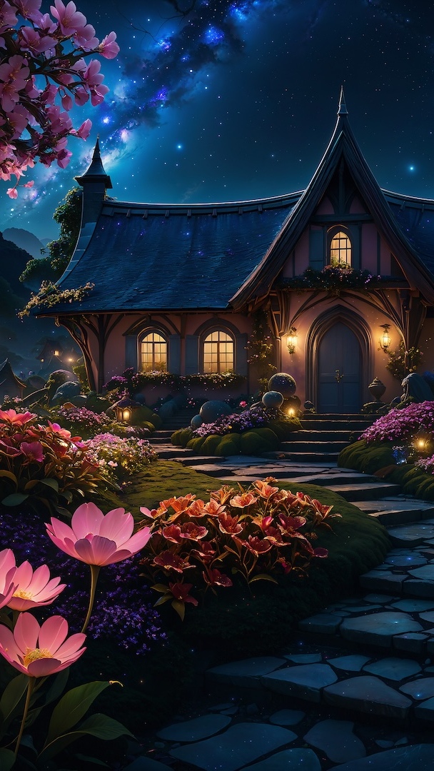 Edytor tapety: Kwiaty wzdłuż schodów i oświetlony dom