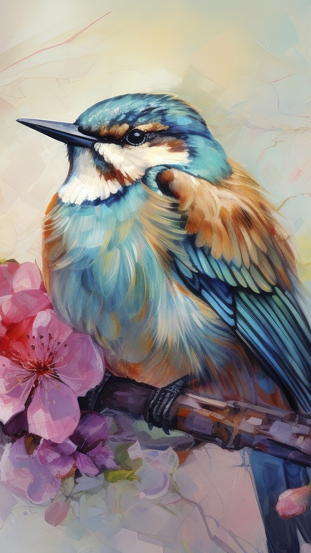 Edytor tapety: Kolorowy ptak na gałęzi w malarstwie