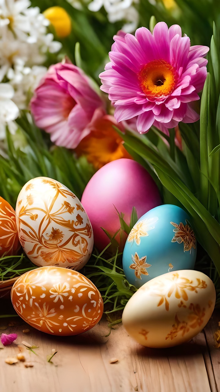 Edytor tapety: Różowe kwiaty i kolorowe pisanki