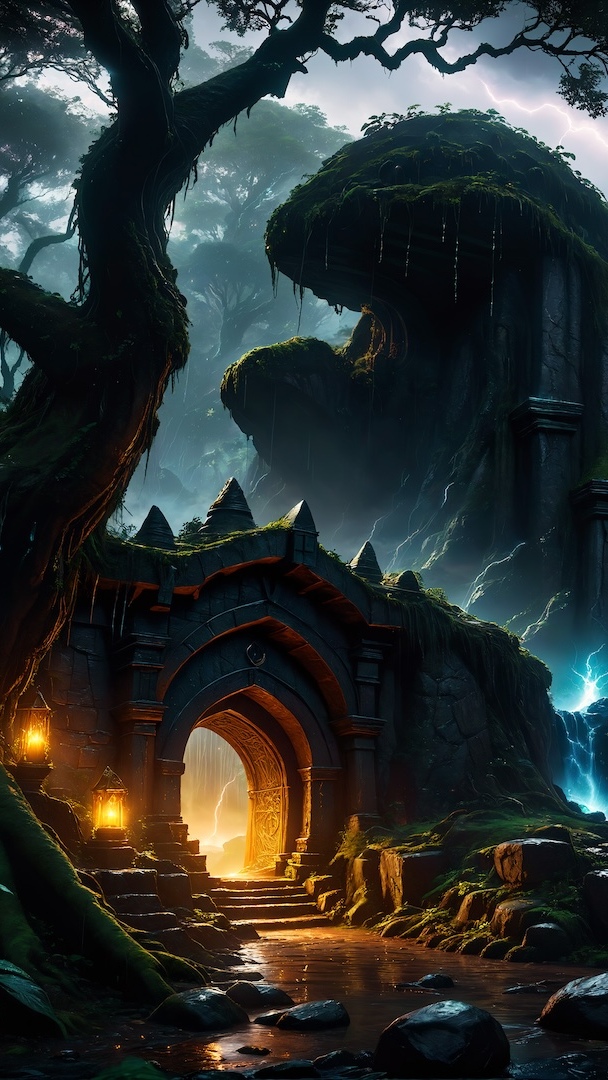Edytor tapety: Drzewa i latarnie przy oświetlonej jaskini