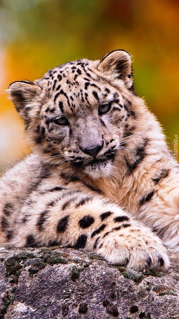 Edytor tapety: Irbis wylegujący się na skale