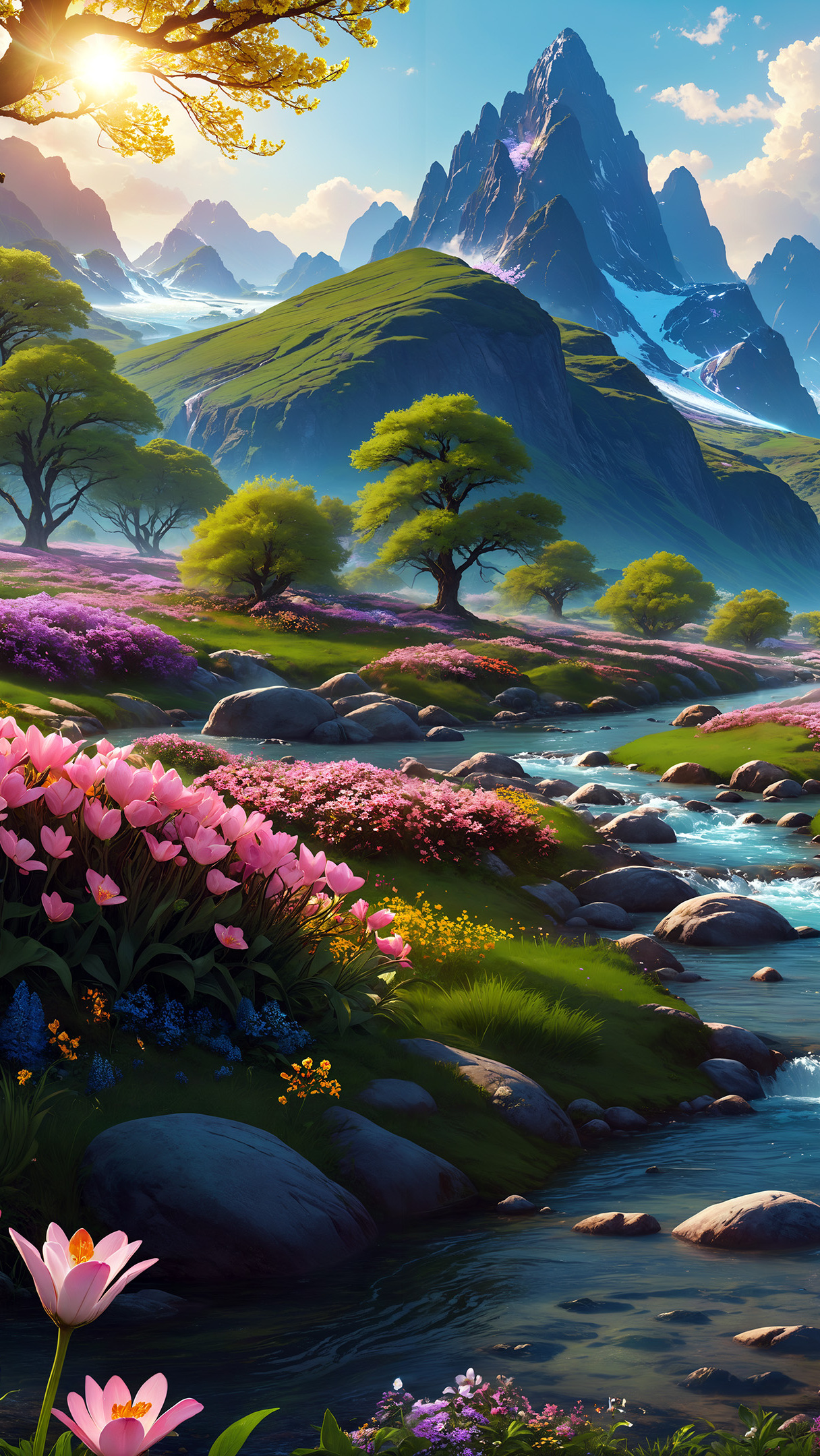 Edytor tapety: Wiosenne kwiaty nad górskim potokiem