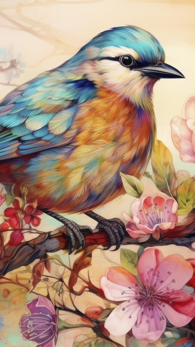 Edytor tapety: Ptak i kwiaty na gałązce