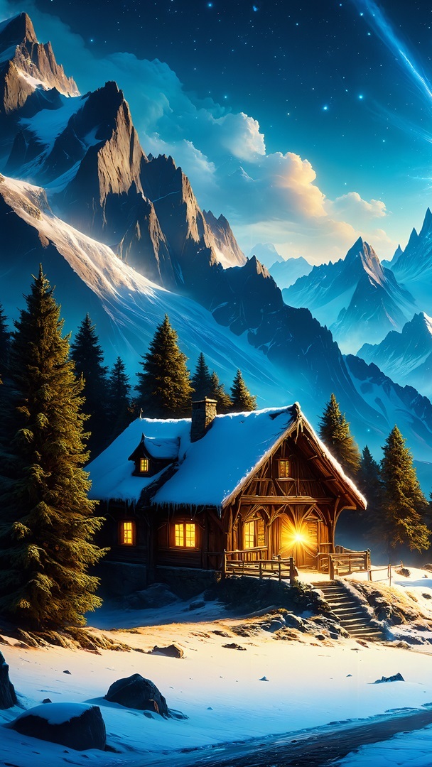 Edytor tapety: Drewniana chata pod ośnieżonymi górami