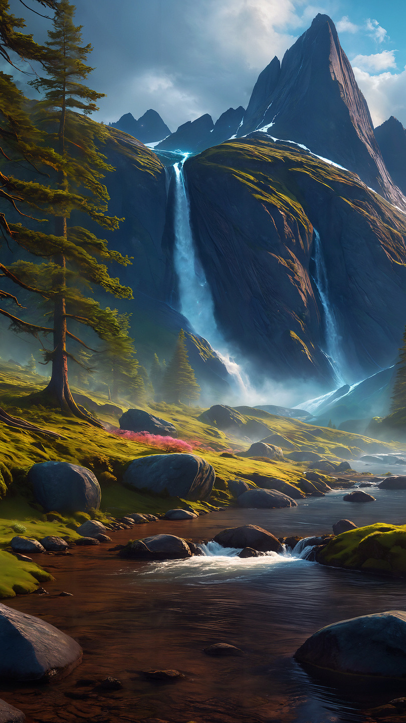 Edytor tapety: Wodospady na skale w górach