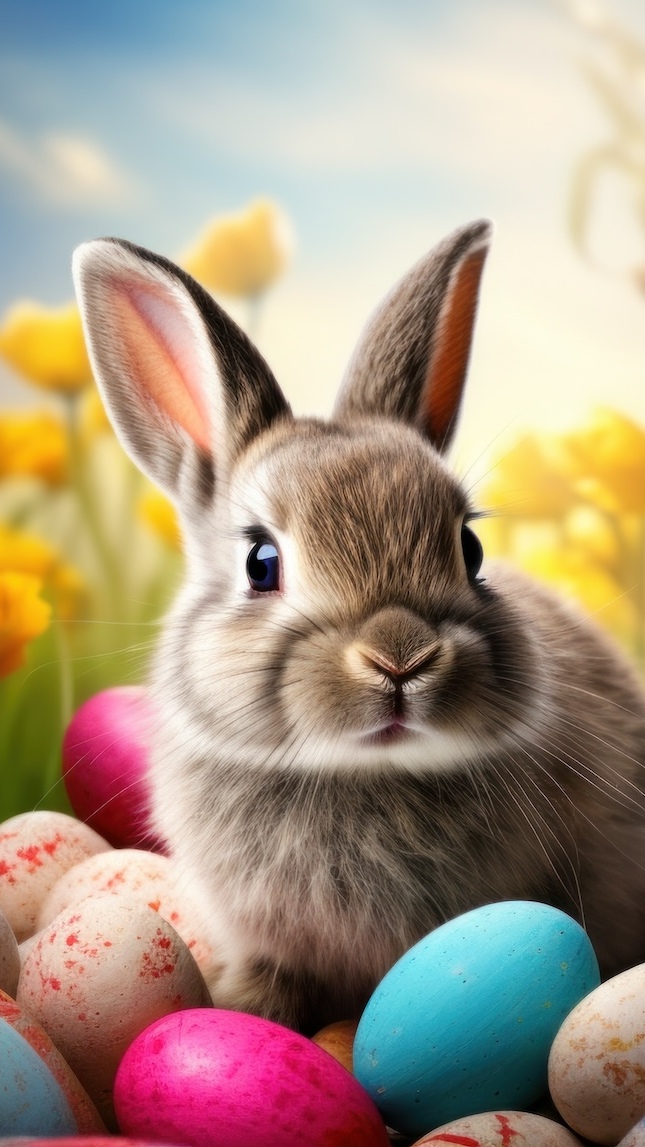 Edytor tapety: Królik wśród kolorowych pisanek