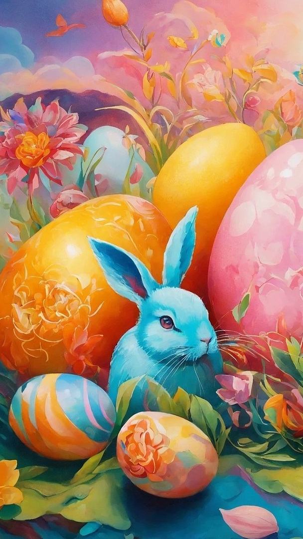 Edytor tapety: Niebieski królik obok kolorowych pisanek