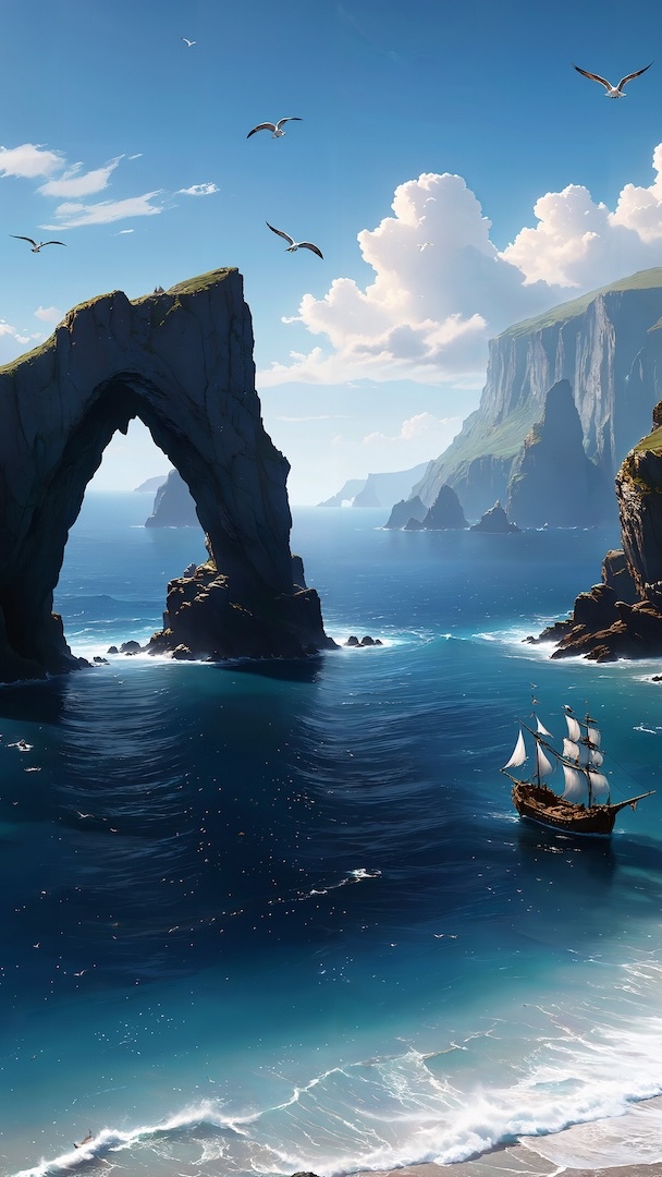 Edytor tapety: Łuk skalny i żaglowiec na morzu