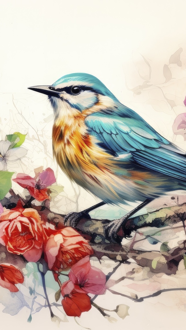 Edytor tapety: Kolorowy ptak i kwiaty na gałązce