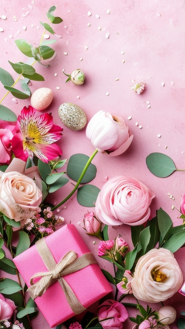 Edytor tapety: Prezent z kokardką wśród kwiatów