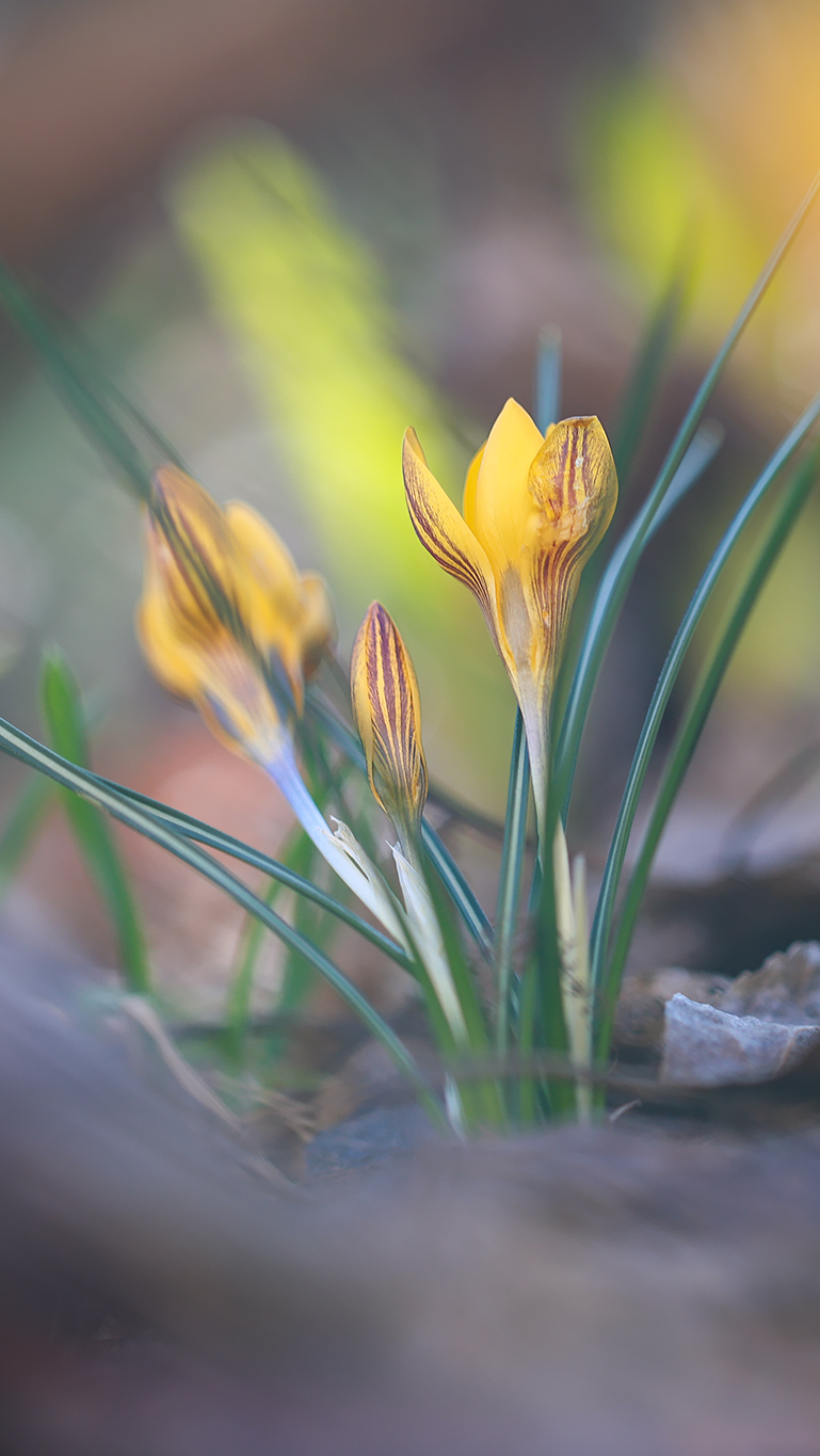Edytor tapety: Trzy żółte krokusy na rozmytym tle