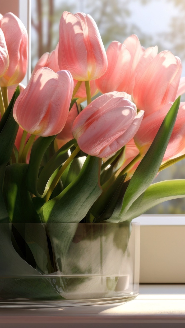 Edytor tapety: Różowe tulipany w wazonie przy oknie