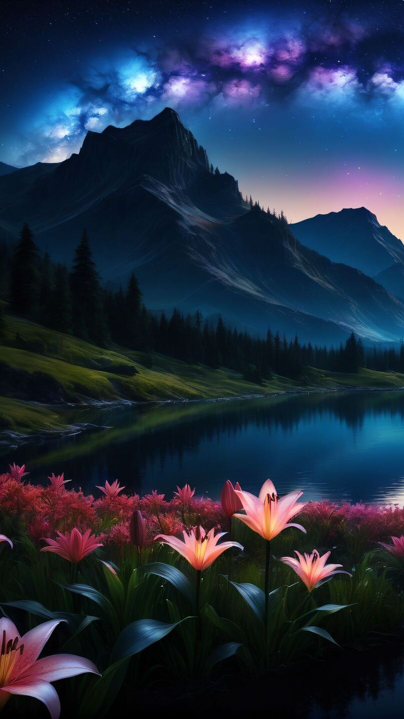 Edytor tapety: Lilie na brzegu jeziora górskiego