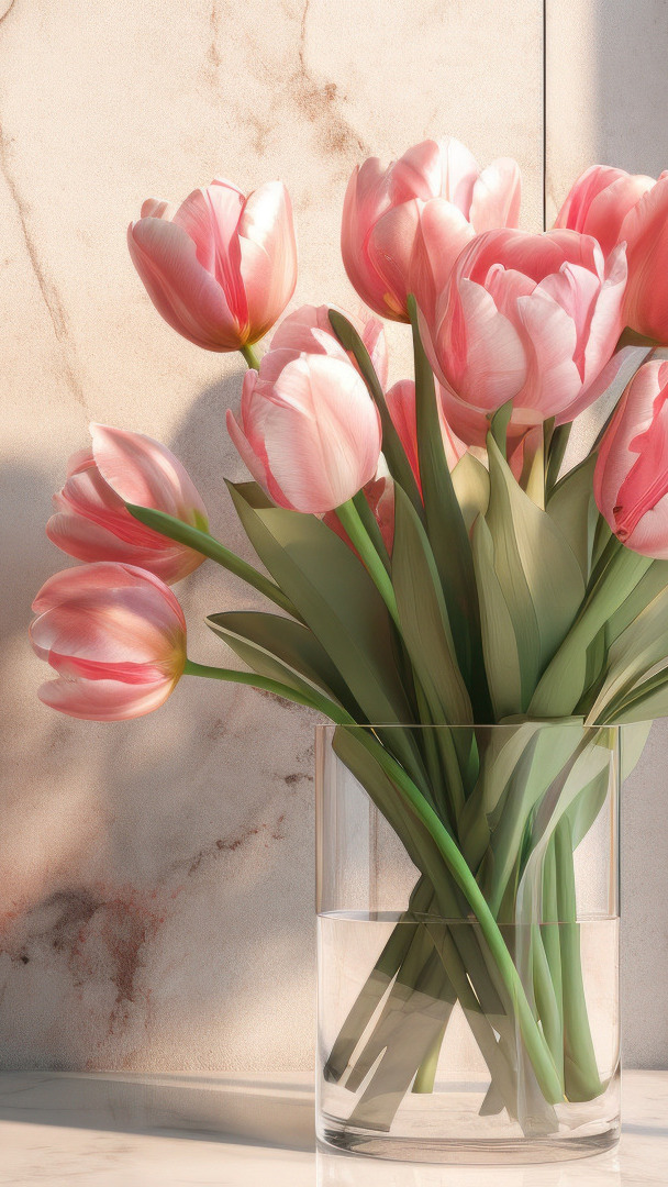 Edytor tapety: Bladoróżowe tulipany w szklanym wazonie