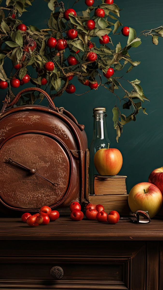Edytor tapety: Zegar i gałązki obok jabłek