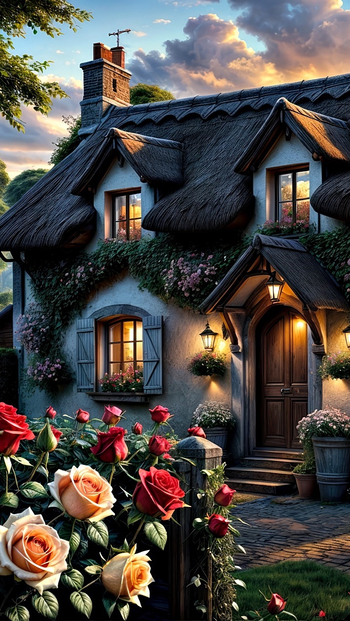 Edytor tapety: Kolorowe róże przed domem