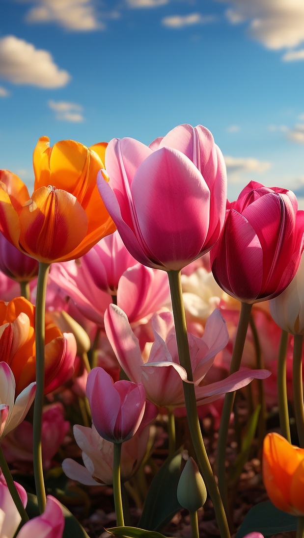 Edytor tapety: Rozświetlone kolorowe tulipany na tle nieba