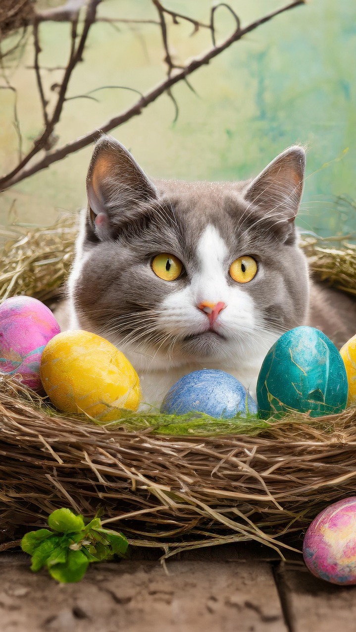 Edytor tapety: Kot z pisankami w ptasim gnieździe