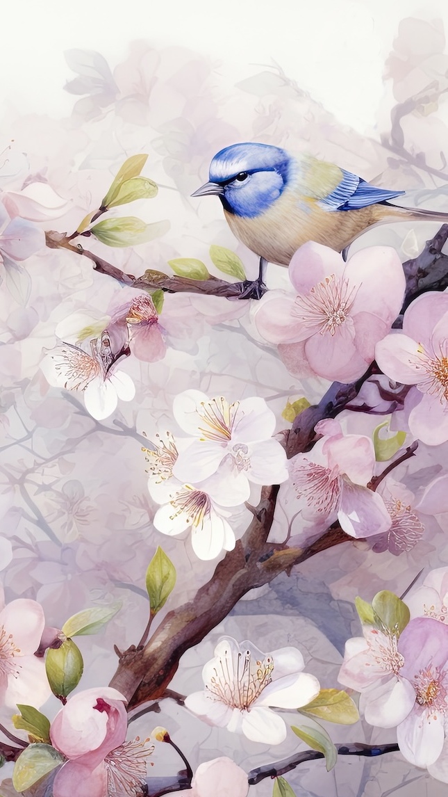 Edytor tapety: Ptaszek i kwiaty na gałązce
