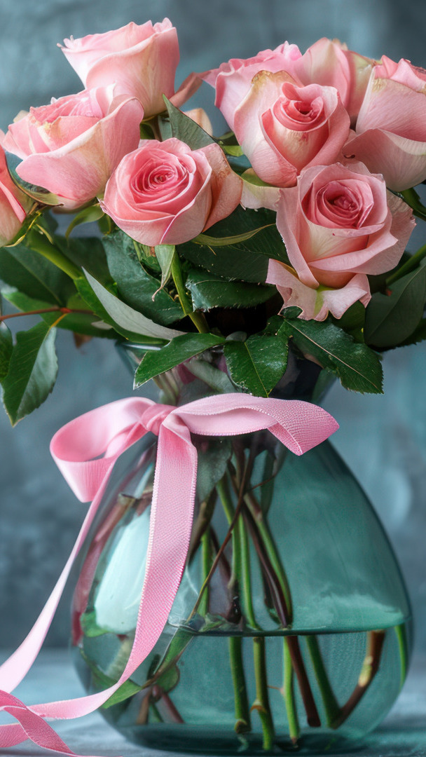 Edytor tapety: Różowe róże w wazonie ze wstążką