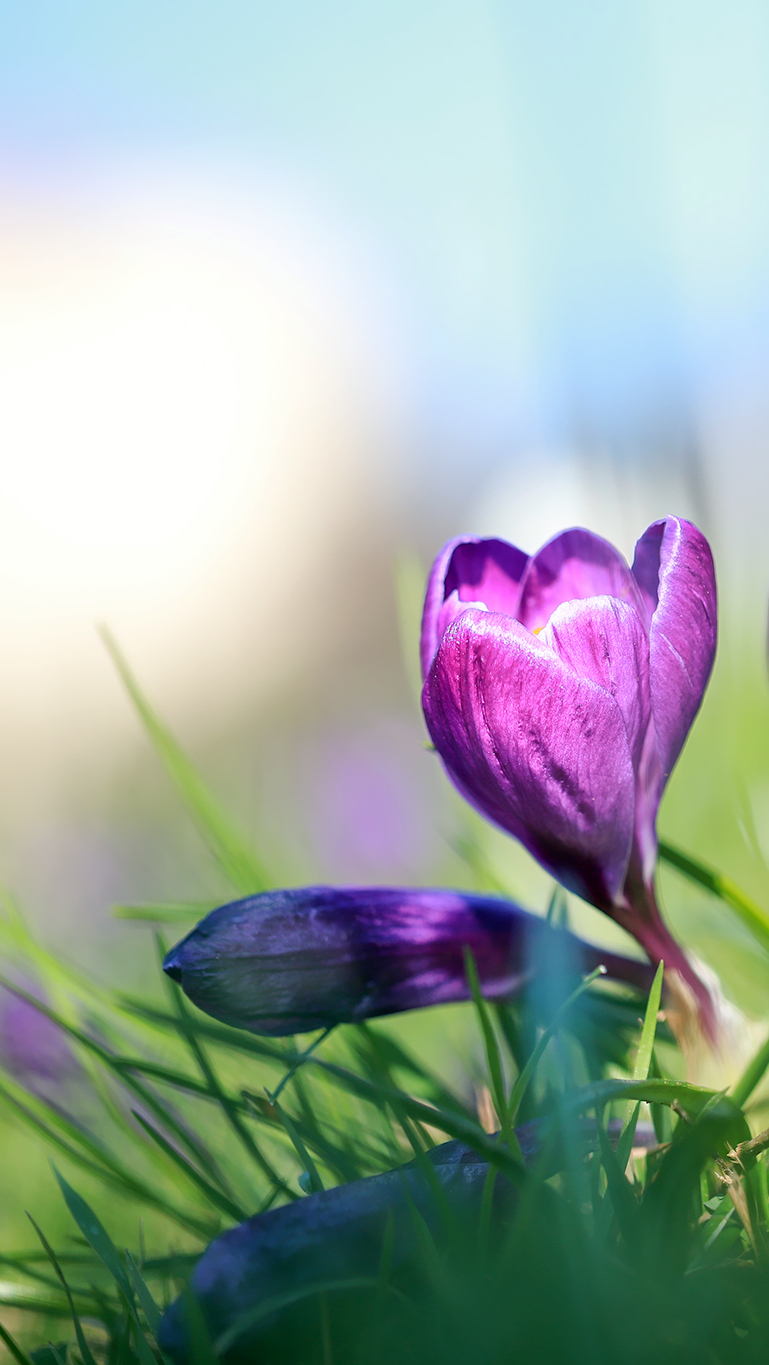 Edytor tapety: Rozświetlone rozkwitające fioletowe krokusy w trawie