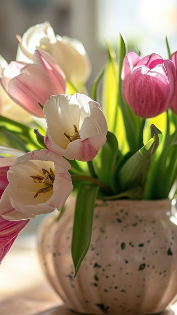 Edytor tapety: Rozwinięte rozświetlone tulipany w wazonie