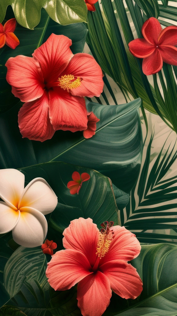 Edytor tapety: Kolorowe hibiskusy wśród liści