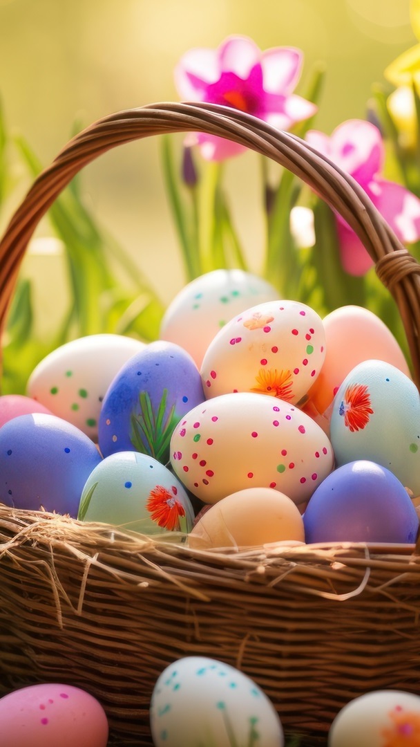 Edytor tapety: Koszyk z kolorowymi pisankami w zbliżeniu