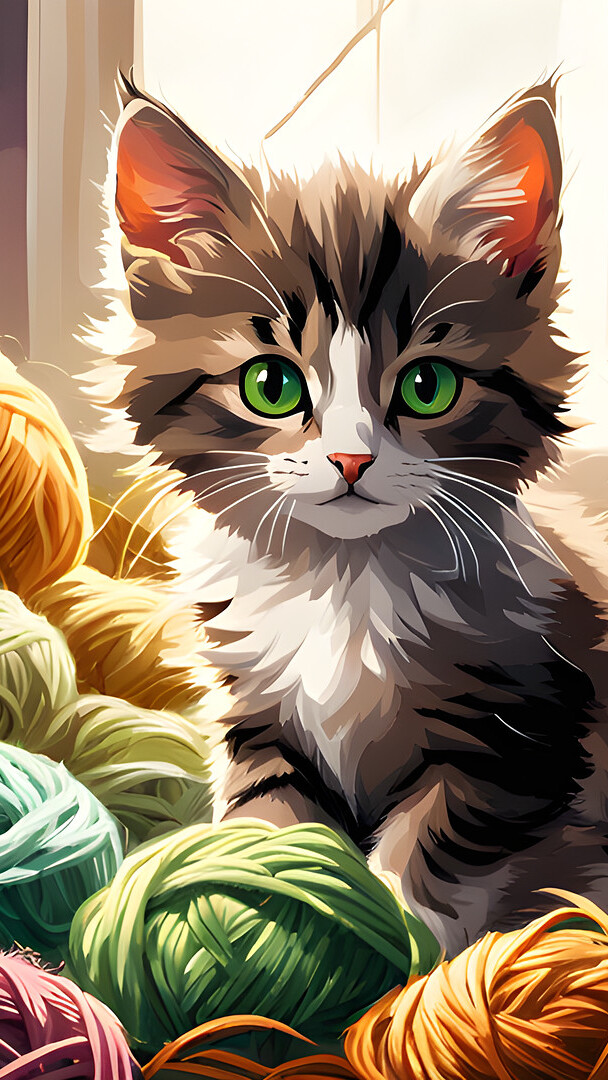 Edytor tapety: Kłębki wełny i zielonooki kot