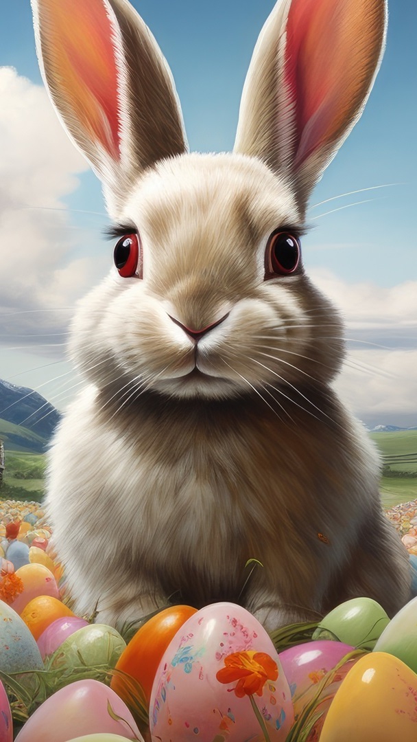Edytor tapety: Królik w zbliżeniu i kolorowe pisanki