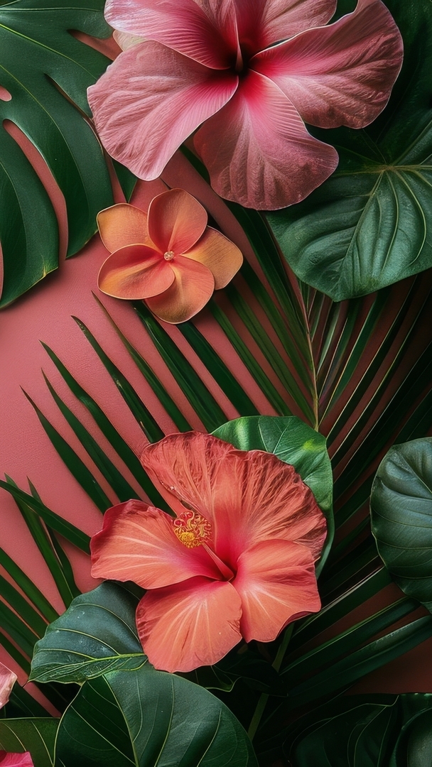 Edytor tapety: Kwiaty hibiskusa na liściach