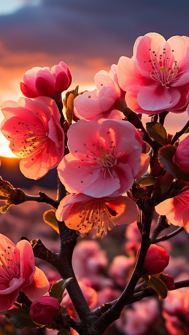 Edytor tapety: Rozświetlone różowe kwiaty drzewa owocowego