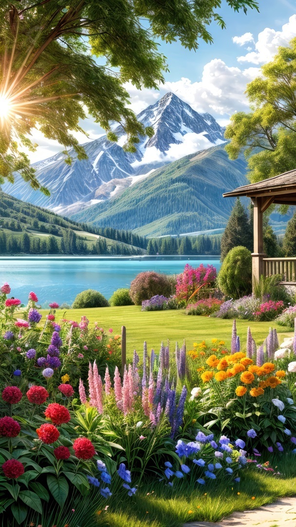 Edytor tapety: Ogród kwiatowy na brzegu jeziora