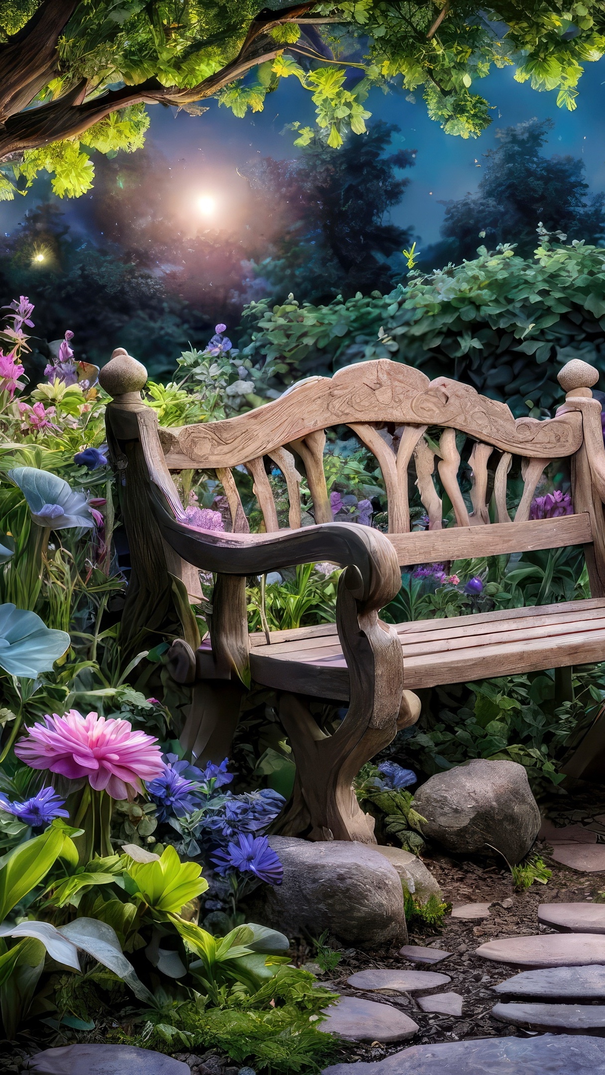 Edytor tapety: Ławka w ogrodzie w księżycowym blasku