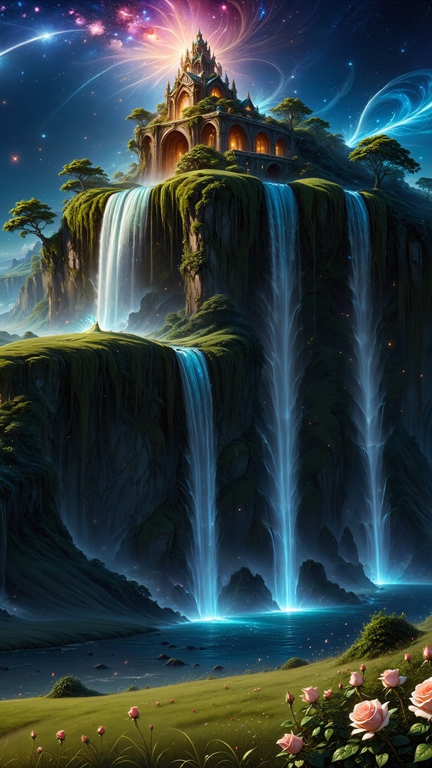 Edytor tapety: Zamek i wodospady na skale